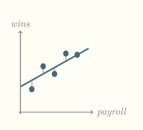 In the following pictures, the prediction line on the right is better than that on the left by an amount proportional to the difference between the total length of pink lines in the two pictures. Notice that both lines represent the very best possible prediction for *that* set of dots. It's just that, on the right hand side, there's a closer correspondence between payroll and wins.